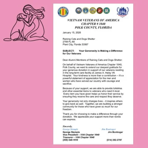 For our very first donation drive, we chose Vietnam Veterans of America of Polk County Chapter 1040. This is special to us because it is special to two of our favorite adopters, Kenny and Debbie Weberman. The Webermans adopted a cat and dog from us, attend nearly every RCAD event and regularly collect linens for our shelter pets from the people in their community. When we heard that Kenny, a Vietnam veteran, has spent the past 5 years collecting toiletry items for long term care patients at the Veterans Hospital and that these items are not provided to these patients unless they are donated, we knew this was something that we wanted to help with. Our group collected shampoo, body soap, shaving cream, razors, toothpaste, toothbrushes, underwear, and deodorant.